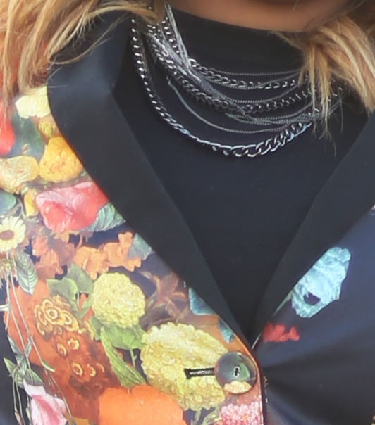 Nicole is wearing a beautiful gunmetal chain necklace [similar http://goo.gl/aQgeiP ]. I chose gunmetal because it pairs nicely with the jacket without being a distraction.