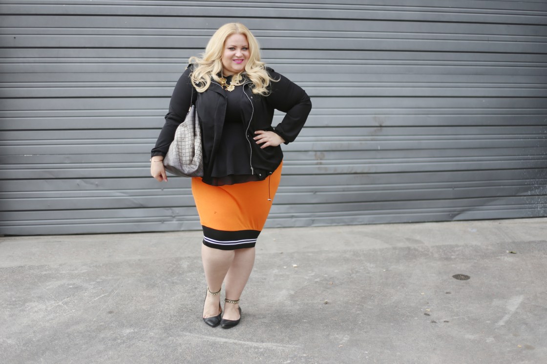 I ordered this darling sporty chic pencil skirt from Boohoo [similar here: http://goo.gl/8AlP7R OR http://goo.gl/tzcpVZ] recently because it satisfied my craving for something new and fun, with minimal risk. This skirt is a US size 20 and it fit both me and Nicole quite well. Neither of us are wearing spanx- so while the material is a little thin [this will be perfect for summertime], it is not revealing.