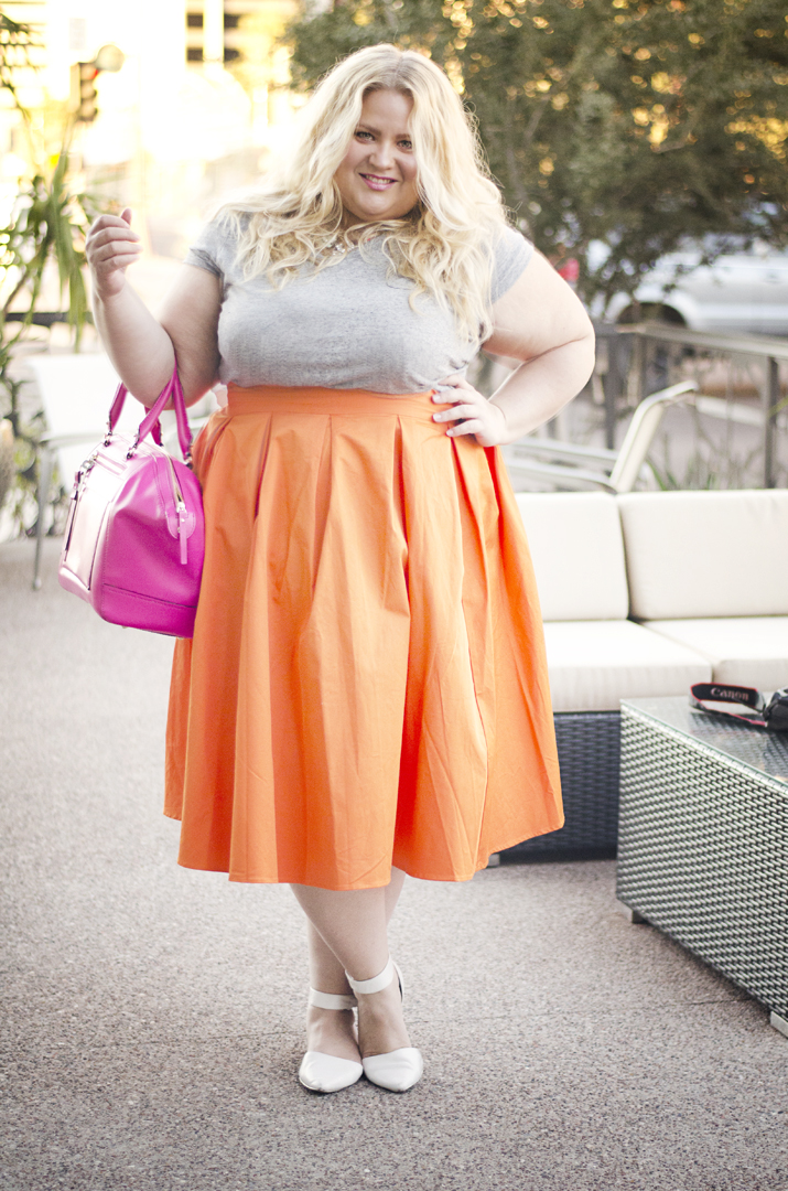 I’ve always been a big fan of orange – it’s clearly pink’s little sister. So when I saw this skirt online, I just had to have it. Luckily, Eloquii’s midi skirts are always on point so I knew that when I received this in the mail, it would be perfect. I wanted to wear it with another bright color for a fashion event because bright colors showcase my personality. I paired this fab midi skirt with my favorite Kate Spade bag [similar], a simple gray t-shirt [similar], white flats [similar] and a fab spring statement necklace [similar].