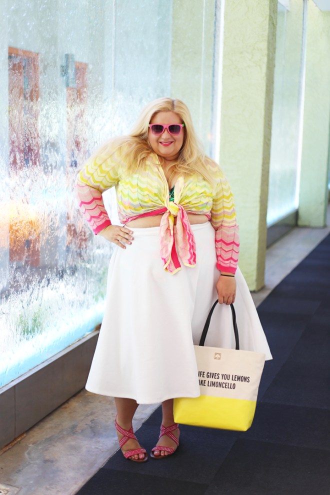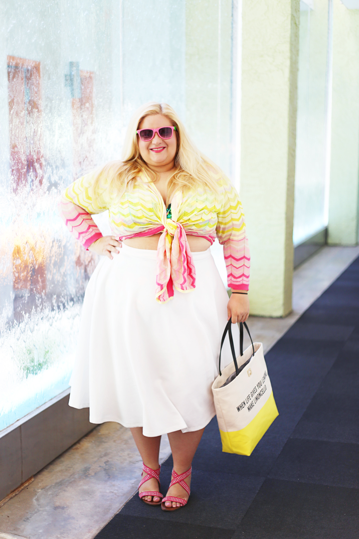 Clearly there’s a trend happening here. For those of you who loved Barbie as much as I did – I give you my interpretation of California Dream Barbie. If she were modern and plus size, she might have chosen a gorgeous bikini from Forever 21, a fab midi skirt from Eloquii and the most adorable Kate Spade tote around as the perfect California girl ensemble.