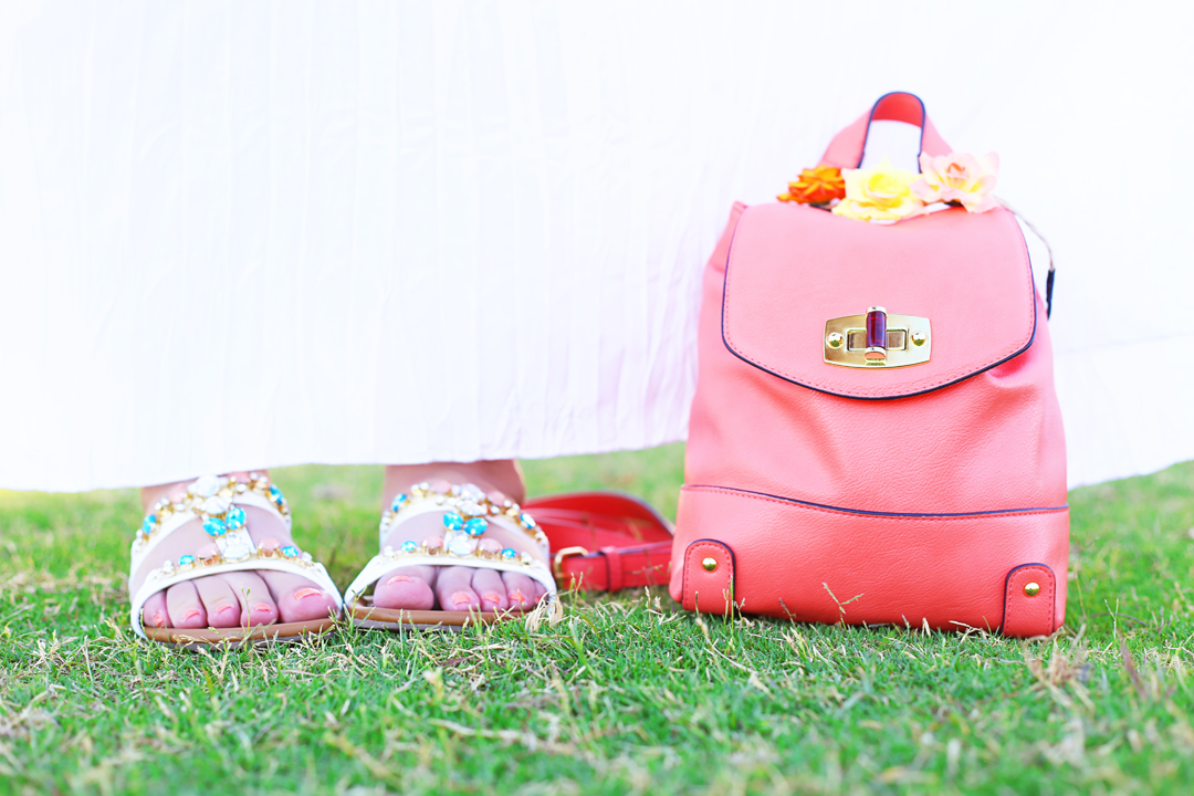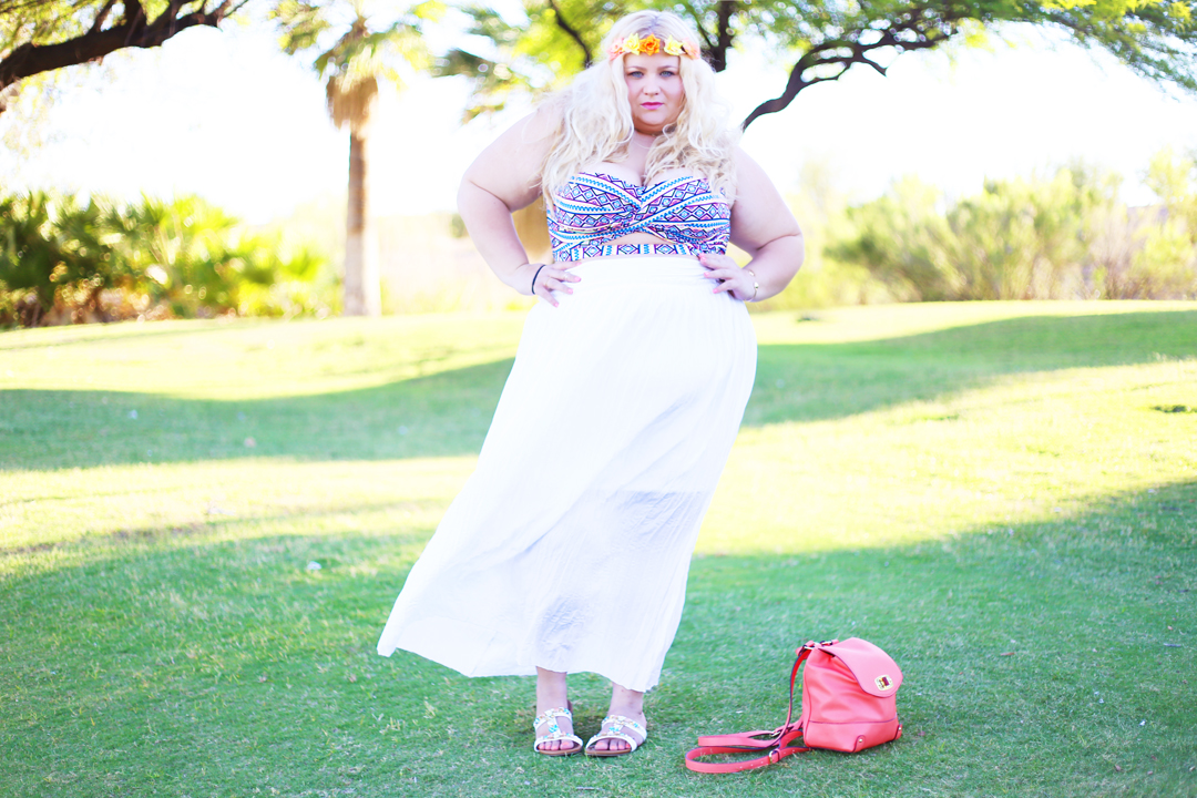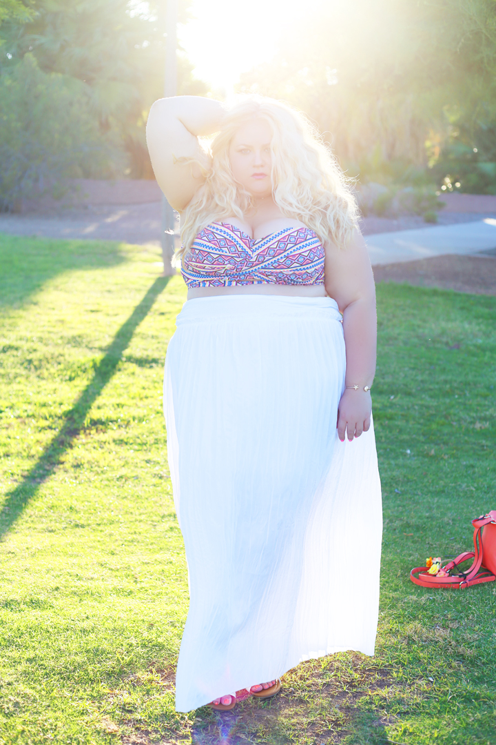 bikini top |halo [similar]| skirt via Saks [I’m wearing an xl] [plus size alternative]|sandals via Kenneth Cole [similar] |backpack via Target [similar]| necklace via Rocksbox [use code boardroomblondexoxo for one month free]