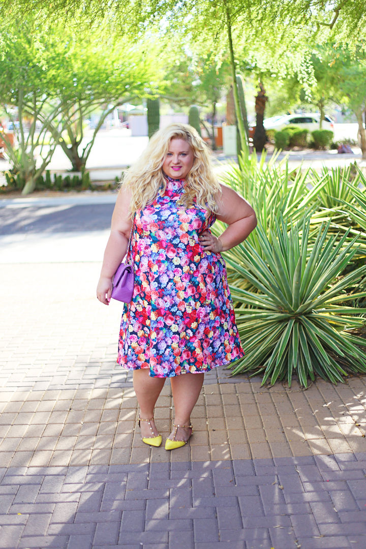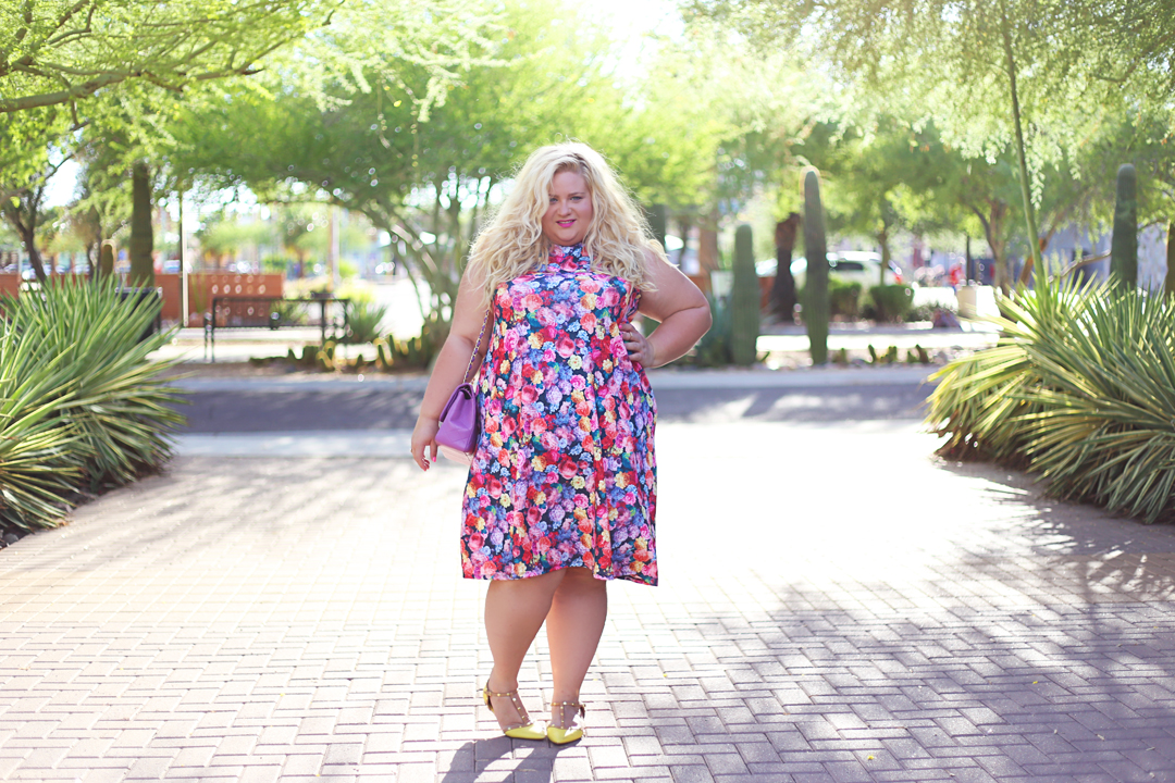 When I found this dress online, I saw it when it was at the regular price and I debated about whether it would be as pretty in person as it was online. Thankfully, it was still available when I was ready to get it. I got this dress for under $20, which was even more incredible to me when I saw how wonderful it looks on and how comfortable it is. The fabric has a slight stretch, its cut almost like a swing dress but its not quite as roomy as this one. I’m wearing a 22 and it is quite long which is perfect for the office. Since I live in Phoenix, and corporate culture tends to be a little bit more relaxed here in the summer time, I’ll probably not wear a blazer over it, but I think it would be really cute with a cropped navy blazer.