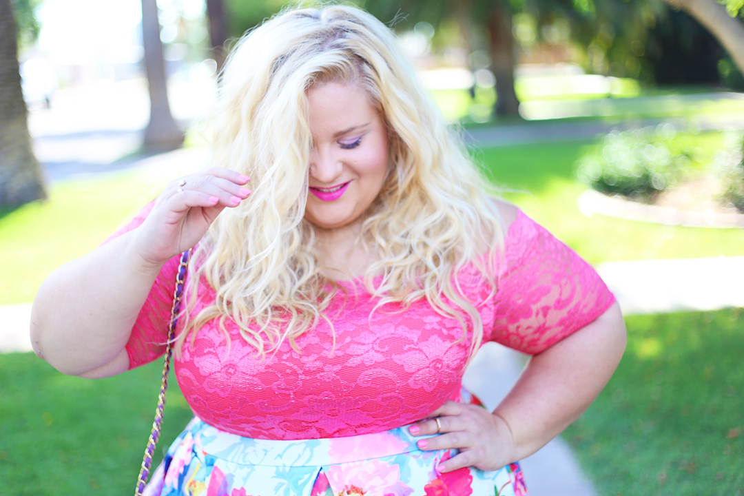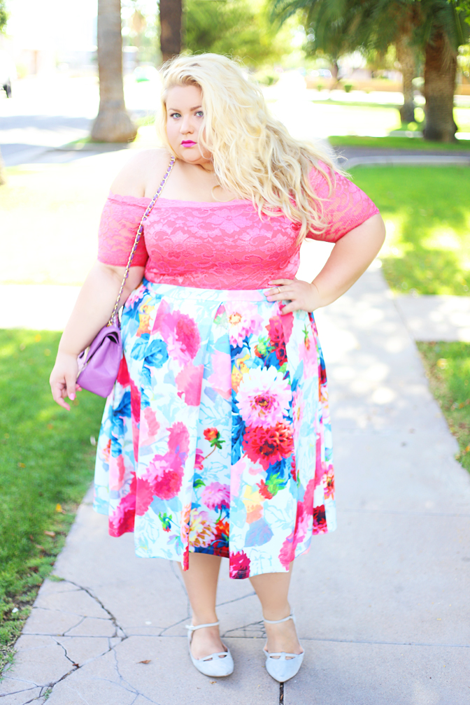 I paired this with an off the shoulder bodysuit [do size up, I’m wearing the UK24], grey flats and a lavender bag. The skirt fits true to size and I’m wearing a US 20. As I pulled these pieces together, I realized that simple Barbie makeup was the only way to go – I’m wearing a soft pink blush on my lids with a bright purple shadow on my lower lid for some depth. I grabbed my favorite pink lipstick and spritzed my hair with a dry oil spray.