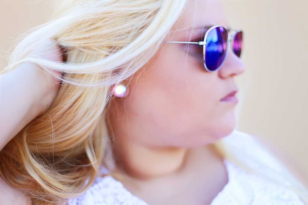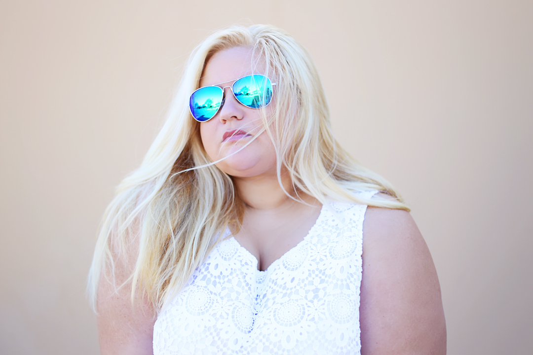 I found these jeans at Forever 21 a month or so ago – and although they’re sold out online, you may be able to find them in a store near you. I’m wearing a size 20 and I was surprised at how well they fit. I paired them with a scalloped lace top from the Lilly Pulitzer for Target collection [3x], a blue clutch, gray flats and bright blue aviators because I wanted the glasses to really pop. This outfit is perfect for a day when you want your basics to be amped up, just a little. I love that when you take the glasses off, this outfit looks much more chic. I’d wear this shopping in Scottsdale or out to dinner with friends; perhaps both!