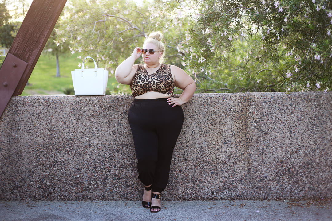 joggers | crop top via Eloquii [similar, similar] | sandals [similar] | handbag via Kate Spade ON SALE! [similar affordable]| necklace – affordable | sunnies via Lane Bryant [similar]