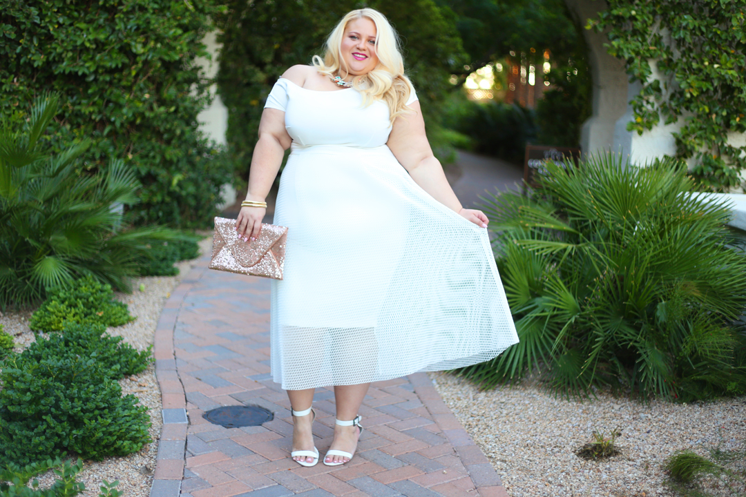 First up is this truly beautiful white body-con dress with mesh overlay, called the Kora. I feel like a total Marilyn in it! Its light enough to rock just about any time of the year. How awesome is that? I’d wear this dress to an event in the summer, fall or winter [with a jacket of course]. Since I live in Arizona, we basically have two seasons – summer and fall so you know I’ll get tons of wear out of this dress! [wearing a 2x, link below]
