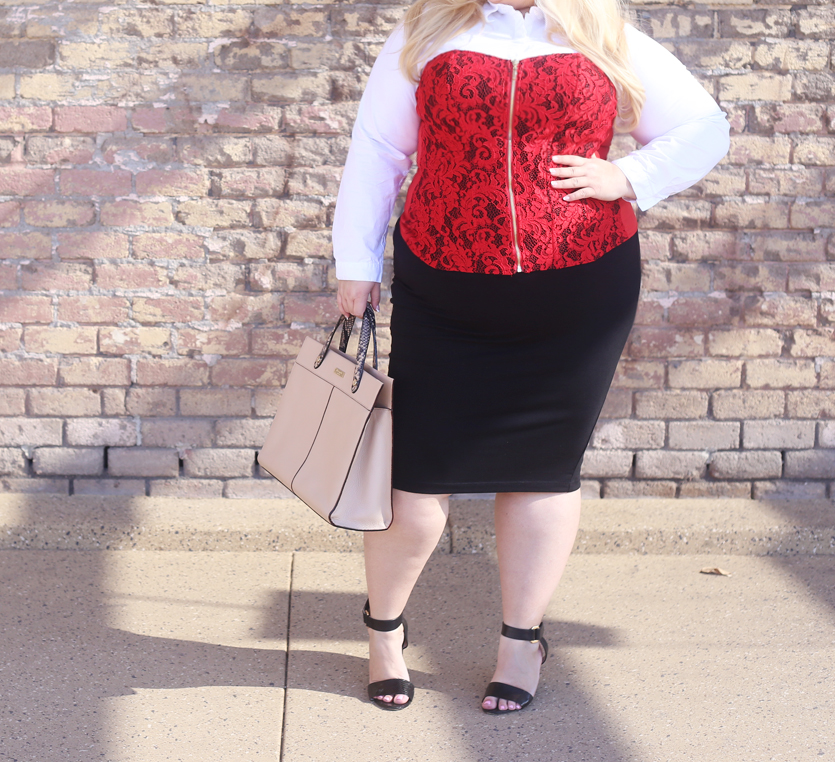 When I saw this corset top, I was inspired to put together another Valentine’s Day look with it as the centerpiece. I paired it with a white button up and pencil skirt and a neutral handbag. I didn’t want anything to distract from this gorgeous piece. Wear it as I have or pair it with jeans or a skirt for a night out. [wearing the 3x, some stretch]