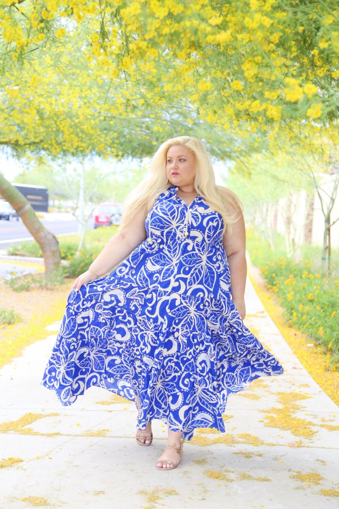 This is THE maxi dress of the summer! It’s not only well made but fits just right [18/20]. I live in a warm climate – so lightweight fabrics are a must. This dress is made of a nice lightweight cotton [no stretch] and it is accented with beautiful gold string. I love that it isn’t snug in the chest -so if you have a larger bust like I do, you’ll be pleasantly surprised with how great it fits!