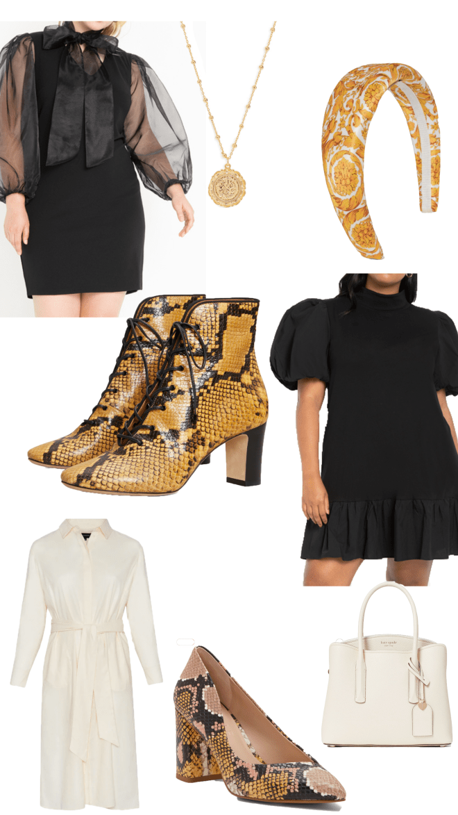 - This shirt dress is so good on so many different body types because it has a drop shoulder so it fits larger arms with a bit more ease. I love the waist tie too – it will be very comfortable for a long day of meetings. I’d pair it with the gold coin necklace and the snake print pumps.