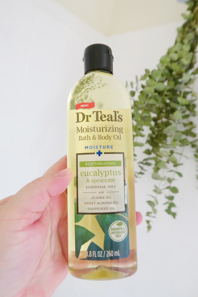 Step 7: Eucalyptus body oil. I use body oils in the shower – that’s a tip I learned from Tommy and it has been life changing for me. I like to put it on as my very last in-shower step and rinse it off afterwards. I find that it leaves my skin really soft but not overly oily and I don’t have to worry about getting oil all over my bathroom rugs this way.