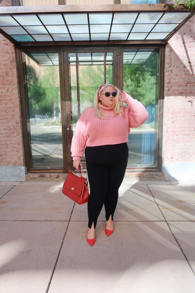 For today’s look, I chose one of my pastel scarves and tied it up into my hair for the perfect headband. I used the scarf as inspiration for the look and chose pieces that complimented it. The scarf has a soft pink, purple, gray and coral in it so I chose lilac glasses, a pink cropped sweater (xl), orange shoes, a black pant and a brown bag.