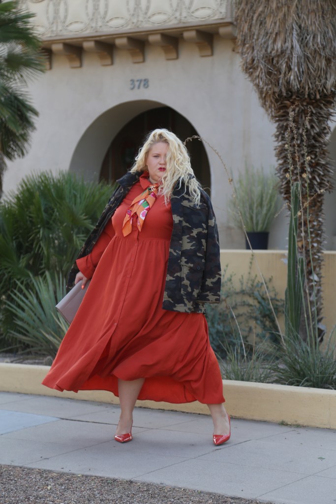What I love about this shirt dress is that it is very versatile – it looks great worn as a dress but you can just as easily unbutton it and wear it as a duster cardigan which makes it very versatile. It is the perfect wear everywhere piece for plus sizes this fall. I love the rust color because it pairs nicely with greens, oranges, mauves and you can even punch it up by popping it on with a neon orange if you are so bold (click here to see how I did it).